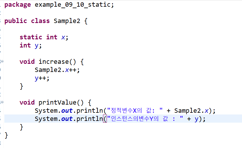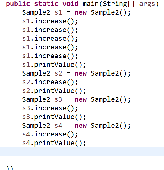 그리고 이후를 보면 s1의 increase의 경우 값이 계속 증가, printvalue의 경우 계속 값이 동일하게 된다는 것을 알 수 있다. class변수에서 관리를 하고 있기 때문에 값을 ++; 시켜서 변화가 있는 것인데,