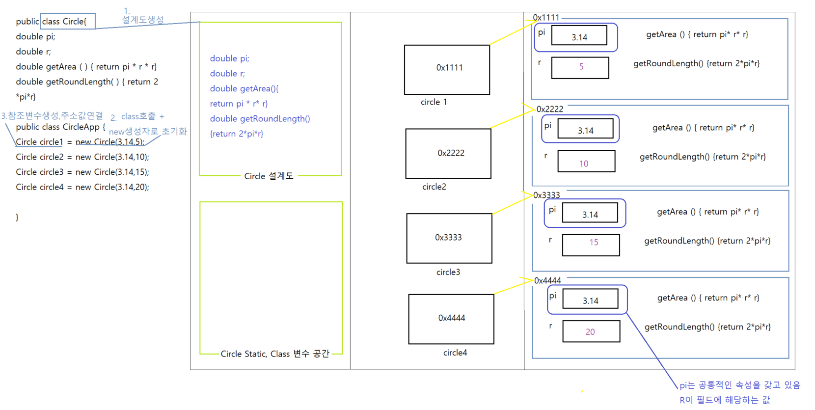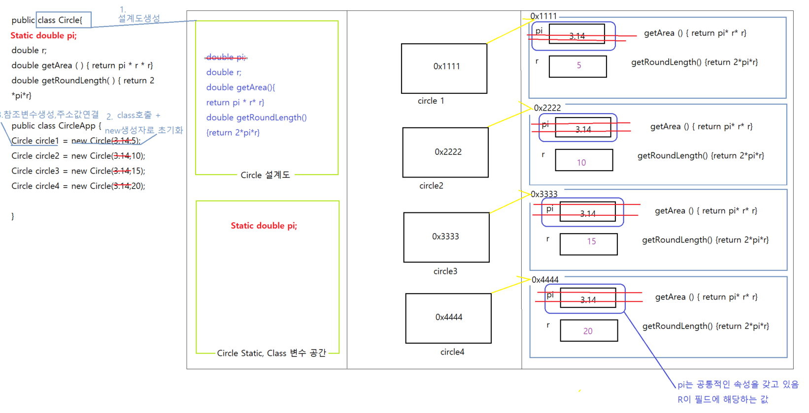 Circle의 클래스를 작성하고 Circle에 생성하는 new연산자를 이용하여, 객체 영역에 객체를 생성하였고 참조 변수에 주소값을 입력하였다. 그런데 객체내부의 멤버 변수중 pi의 경우 중복적인 형태를 갖고 있기 때문에 구별할 수 있는 데이터의 경우 r이 해당된다.
