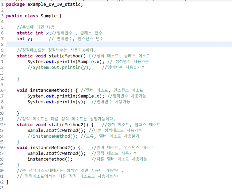 static -->객체생성과 상관없이 사용이 가능한데, 객체 생성 후 사용가능한것은 포함할 수 없음, 당연히 객체는 그냥 사용이 가능한데, 객체 생성 후 사용가능한건 포함 할 수없다. 객체가 생성 후 사용가능한 것은 그냥 사용해도 가능함 어차피 객체 생성할 때 생성하니까, 당연히 설계도가 로딩될 때 객체 생성하기 때문에 클래스변수 클래스 메소드 사용가능하다. 객체 생성되었기 때문에 멤버변수 멤버메소드 사용가능하다. 아래 코딩을 보면 이해가 빠를 것이다.