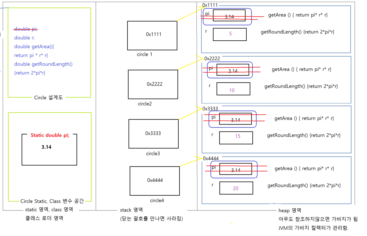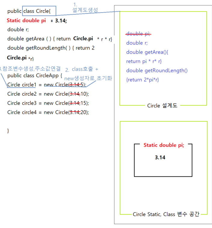메모리 로딩시 1번만 작성해도 완성하고, 클래스의 변수기 때문에 클래스가 관리하고 있기 때문에 클래스 이름으로 접근한다. 원의 너비를 구하기 위해 꼭 필요한 값으로, Circle내에 갖고있깅에는 너무 부담스러워서, Static으로 class에서 관리하도록 하여 객체 내의 pi가 사라지게 되며 클래스 로딩때 변수를 생성하여, 그 클래스를 불러올 때 상주해있어 static은 하나 밖에 만들 수가 없다.