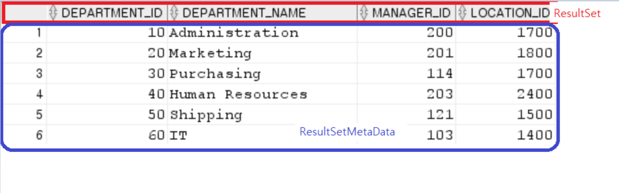 - 조회된 결과의 컬럼이름, 컬럼갯수, 컬럼타입을 입력한 컬럼들의 집합을 의미한다.