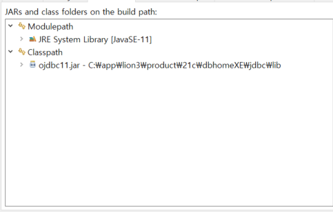 - 외부라이브러리 포함,- > 오른쪽버튼 Libraries->project -> BuildPath->ConfigureBuildPath ->javaBuildpath->classpath ->app/host/lib/ojdbcll.jar -->이제 JRE, Referenced Libraries에 사용