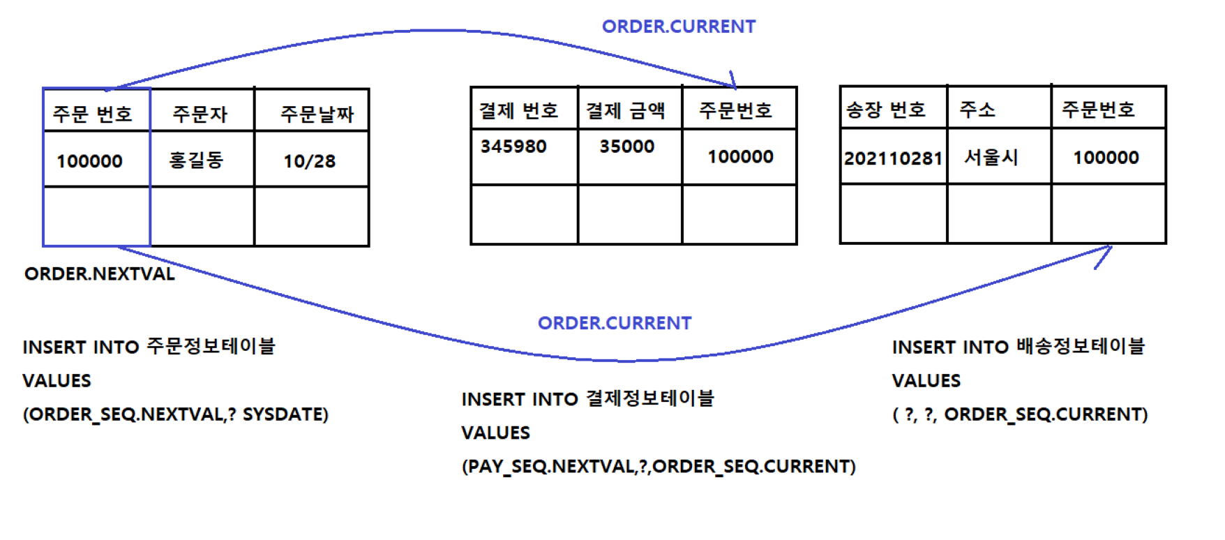 - NEXTVAL에서 생성한 일련번호를 가져와서 다른 필요한 부분에서 다시 사용하는 것이다.