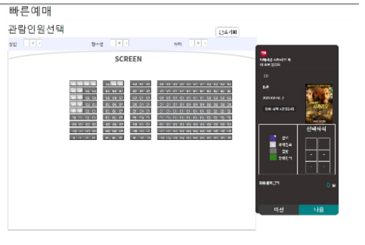 영화관 좌석 예매로 들어가게 되면 영화관에 대한 내용과 예약 날짜, 예약 시간이 출력된다. open API를 이용하여 ajax로 영화사진을 출력한다. 좌석의 모습을 표현하는 색상을 나타낸다.