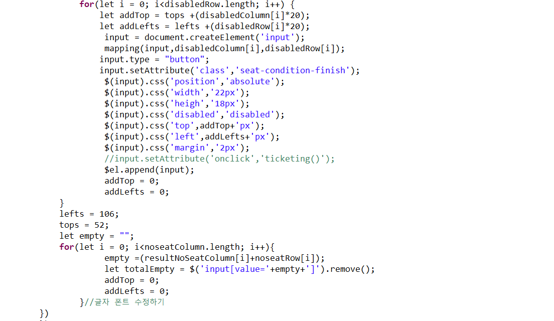 해당 좌석을 for문으로 돌린 부분이다. setAttribute로 class를 지정하여 해당 class가 들어가면 장애인석, 예약완료, 예약가능 좌석이 설정되게 만들었고 css를 이용하여 좌석 위치 부분을 설정, disabled로 css효과를 주어 해당 좌석이 클릭이 어렵게 설정했다.