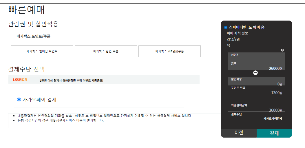현재는 포인트만 사용하고 있기 때문에 할인 쿠폰과 영화 쿠폰에서 쿠폰등록을 클릭하면 alert로 메세지가 출력된다. 포인트에서는 현재사용가능한 포인트가 출력되며 해당포인트를 클릭하고 적용을 누르면 포인트가 적용되고, 실제 금액의 5%가 포인트 적립, 할인 적용의 금액, 최종 결제 금액이 출력된다.
