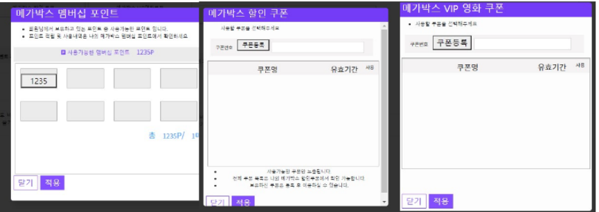 메가박스 포인트와 쿠폰을 클릭하면 해당하는 모달창이 출력된다.