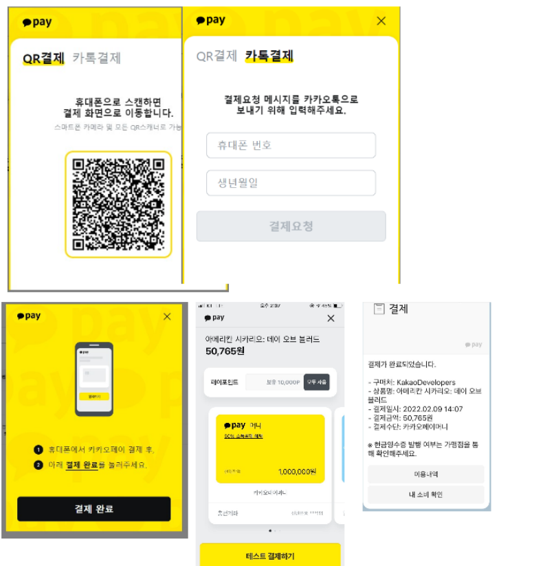 결제 버튼을 클릭하면 카카오데모API가 작동을 하고 QR스캔 혹은 핸드폰 번호를 입력하면 해당금액에 대해서 핸드폰으로 카카오 메세지가 전송이 되고, 테스트 결제하기 완료를 누르면 결제 부분에 대해서 카카오톡 메세지가 전송되고, 결제가 와료가 되면서 메인페이지로 전송된다.