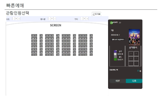 영화관 별로 전체적인 좌석과 통로로 사용하게 되는 좌석, 예약완료 좌석이 출력되게 된다.