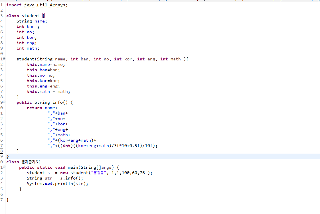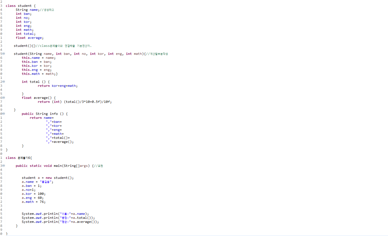 학생 반, 점수등 설정하고 평균, 합계 구하기