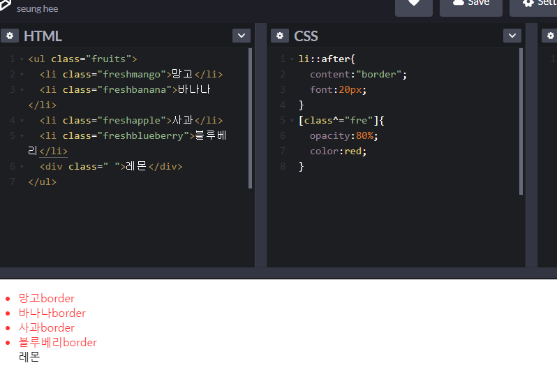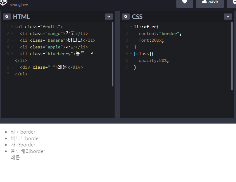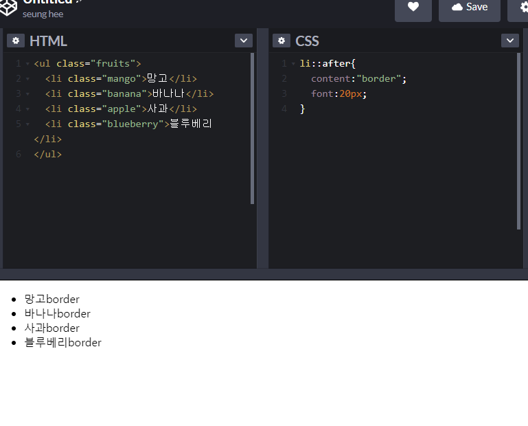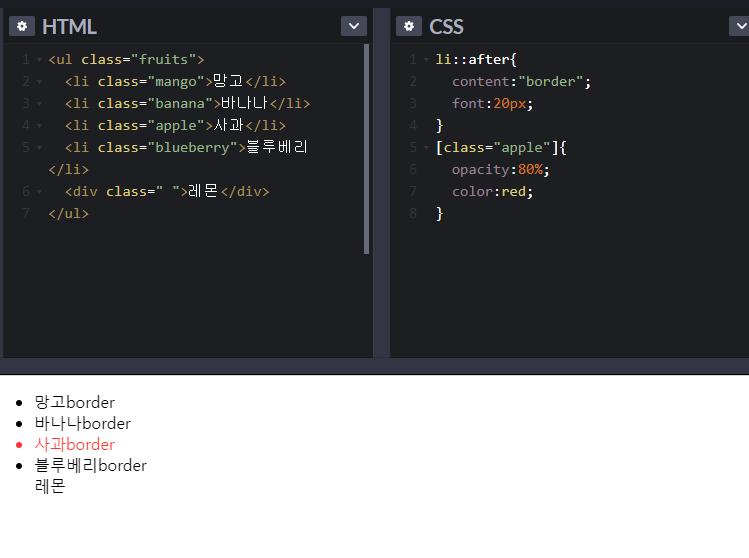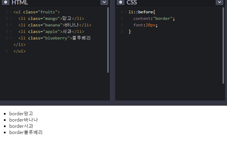 li요소 뒤에 border이란 content생김 - before특정 요소 앞에 content를 입력후 content에 css요소를 삽입, content내용안에는 아무것도 없이 삽입 가능함, 일단, after과 before을 사용하기 위하여 content를 입력해야한다. 이미지 open경로를 이용하여 이미지도 입력가능