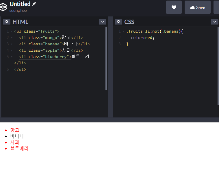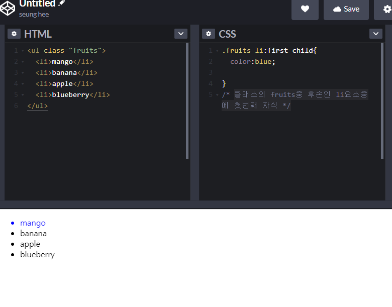- 전체적인 __:first-child를 사용하고 싶을경우 빈칸으로 둬서 기본선택자가 없이 첫번째 자식요소만 선택이 가능하도록 한다.