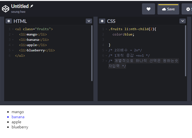 - nth child =몇번째 요소를 선택할 것인가 (n번째 요소) ,짝수만 선택가능 n+3= 세번째요소부터 모두선택가능함