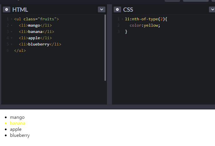 - nth of type = E:nth-of-type(n) E의 타입과 동일한 타입인 형제 요소 중 (div,span,p)E 가 n번째 요소라면 선택하겠다.