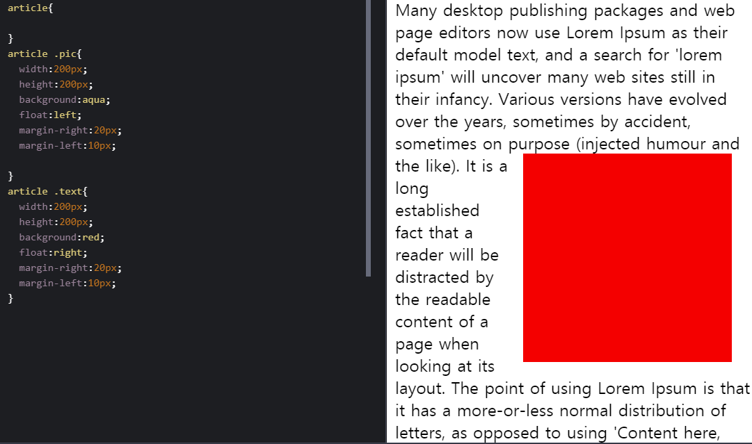 - float의 방향을 의미하고 한컴파일로 예시를 들면 사진과 어울리기 효과를 주는 것이다.