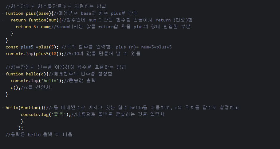함수안에서 함수를 만들어 리턴 함 , 함수안에서 인수를 이용하여 함수를 호출하는 방법